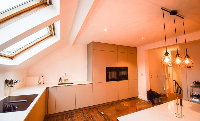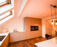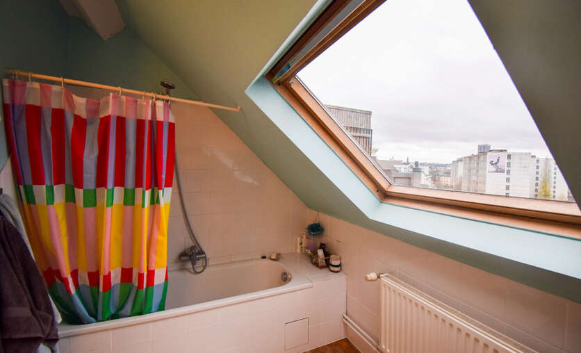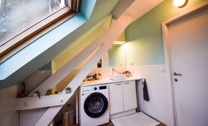 De gelijkvloerse verdieping verwelkomt je met een recent vernieuwde designkeuken en een lichtrijke living, waar grote raampartijen zorgen voor een warme, natuurlijke lichtinval. De renovatie gebeurde met oog voor detail en respect voor het oorspronkelijke karakter van het gebouw, met onder meer de prachtige rustieke balken die meteen sfeer en authenticiteit uitstralen. Verder op deze verdieping bevindt zich een eerste slaapkamer, een badkamer met ligbad, aansluitingen voor wasmachine en een stijlvol lavabomeubel. Je geniet bovendien van een apart toilet en een ruime vestiaire met ingemaakte kasten, ideaal voor wie houdt van comfort en opbergruimte. Kers op de taart is het gezellige buitenplatform met een werkelijk fantastisch uitzicht over de stad.