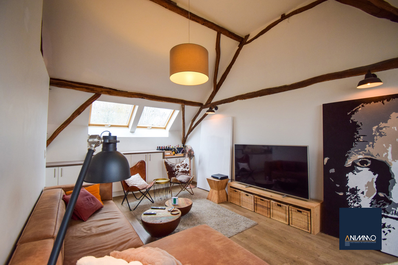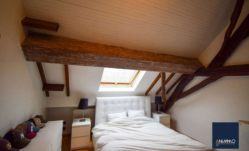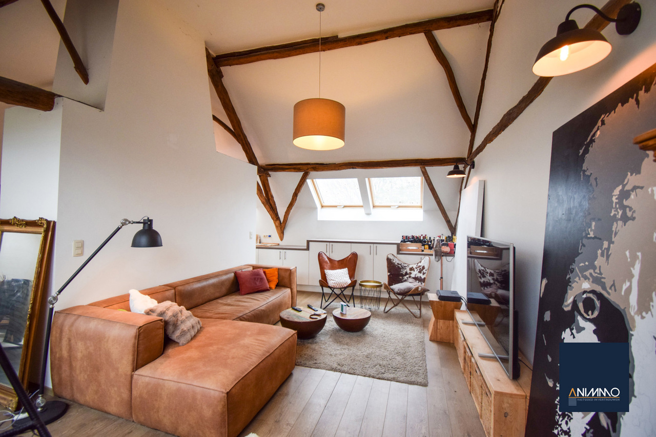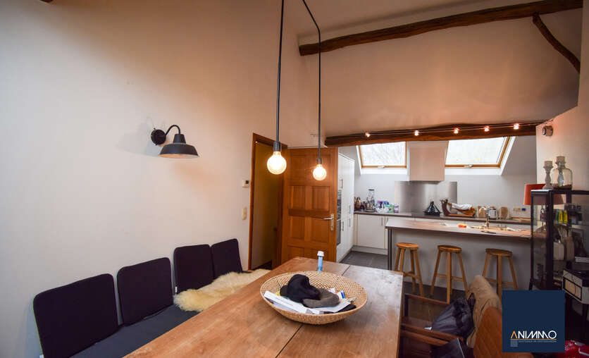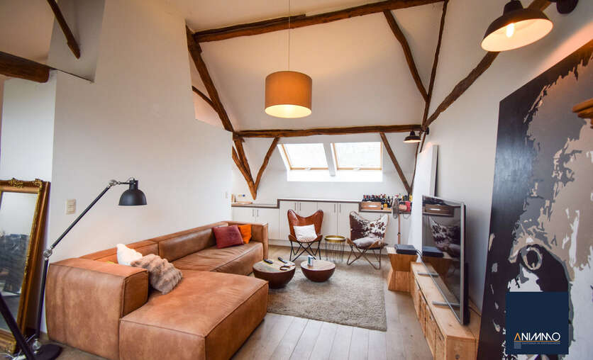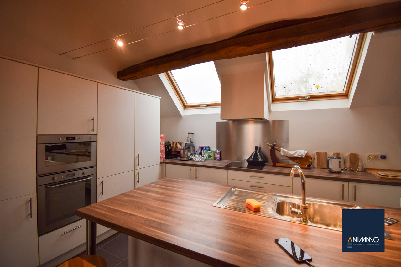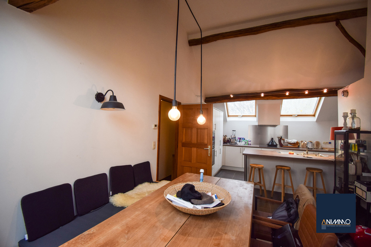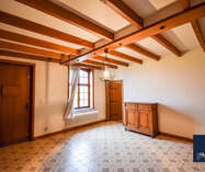 Een deel van de hoeve werd reeds zorgvuldig gerenoveerd tot een stijlvol appartement. Dit appartement beschikt over een praktische wasplaats/berging en een gezellige leefruimte met volledig ingerichte keuken op de eerste verdieping, waar de authentieke elementen mooi bewaard zijn gebleven. Daarnaast is er een slaapkamer en een badkamer met ligbad, douche en toilet.