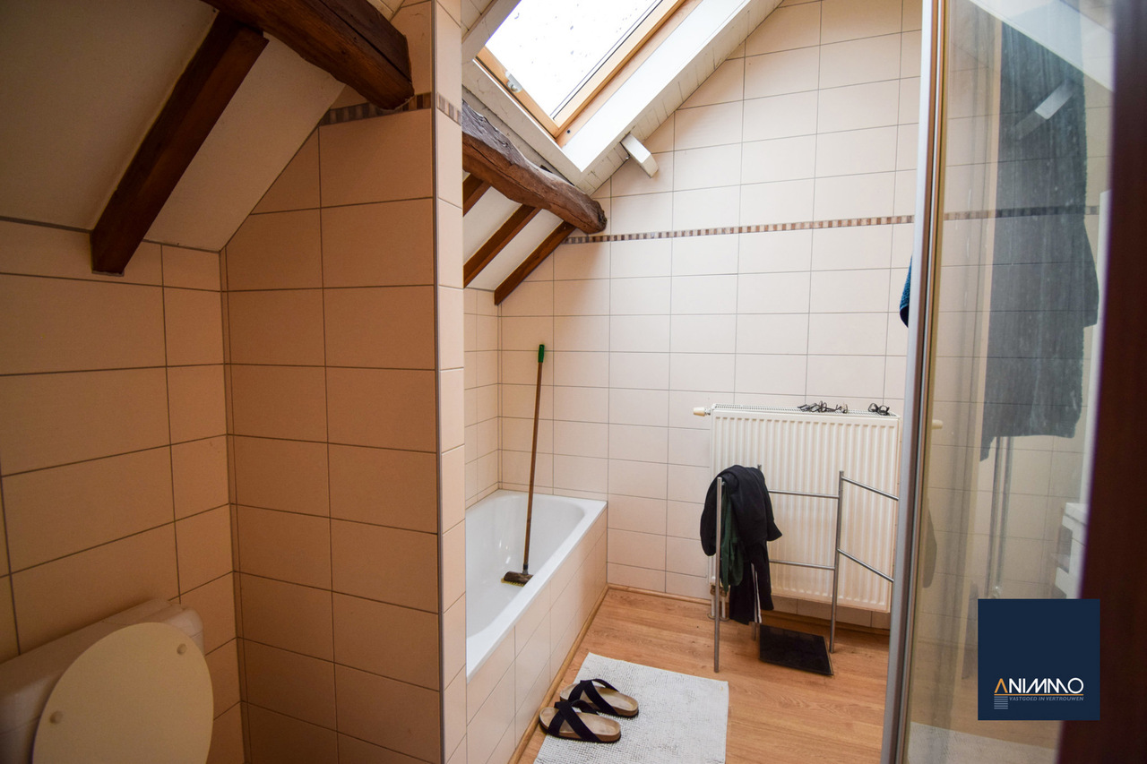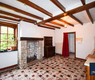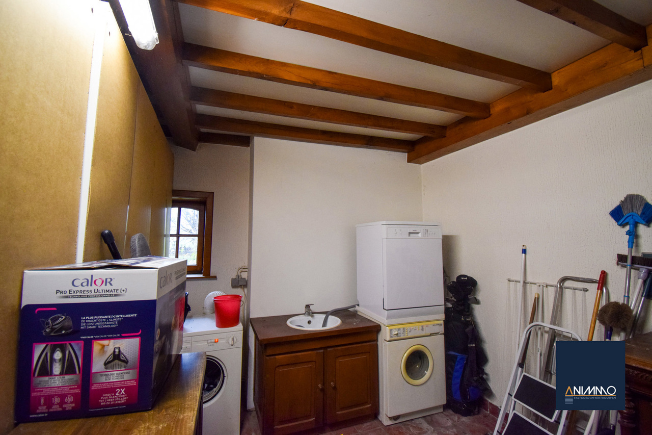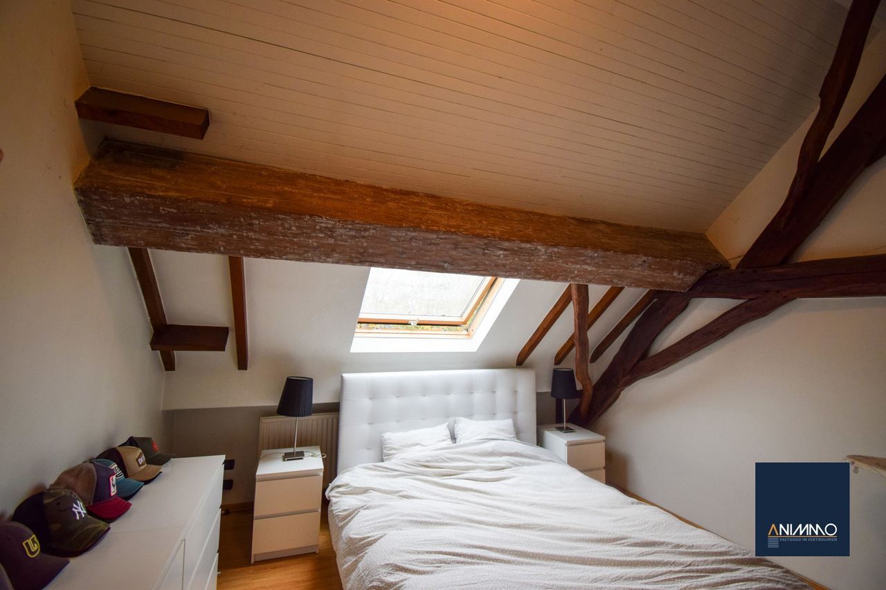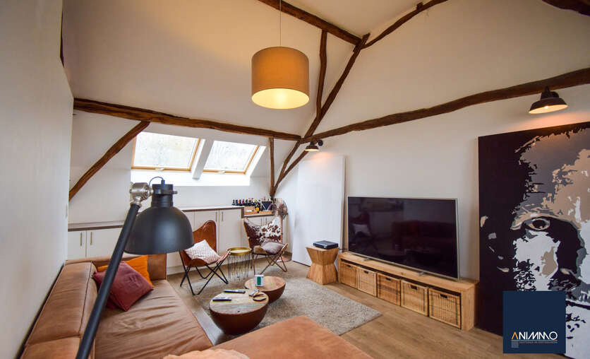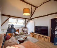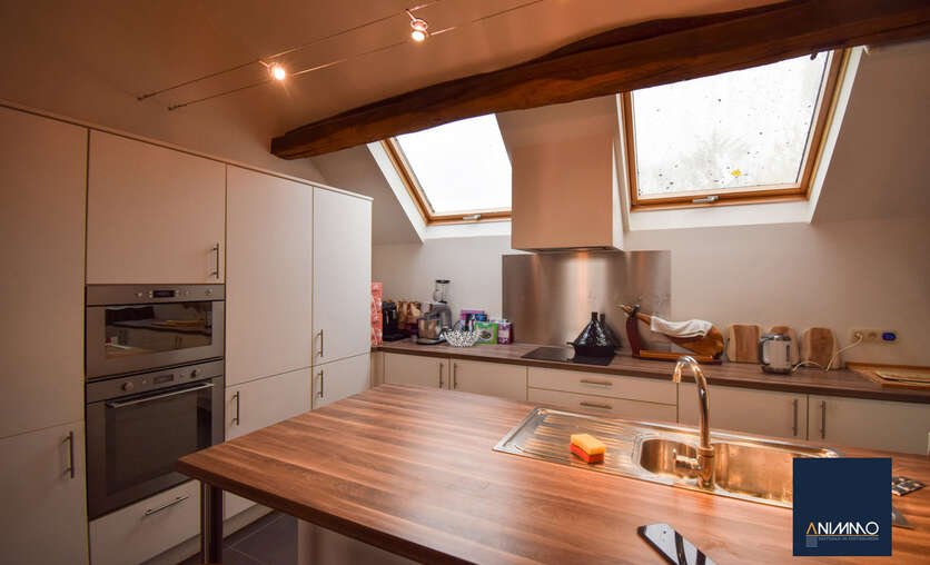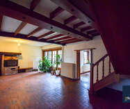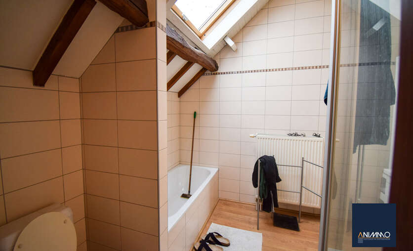 Een deel van de hoeve werd reeds zorgvuldig gerenoveerd tot een stijlvol appartement. Dit appartement beschikt over een praktische wasplaats/berging en een gezellige leefruimte met volledig ingerichte keuken op de eerste verdieping, waar de authentieke elementen mooi bewaard zijn gebleven. Daarnaast is er een slaapkamer en een badkamer met ligbad, douche en toilet.