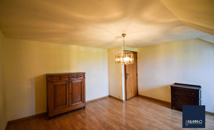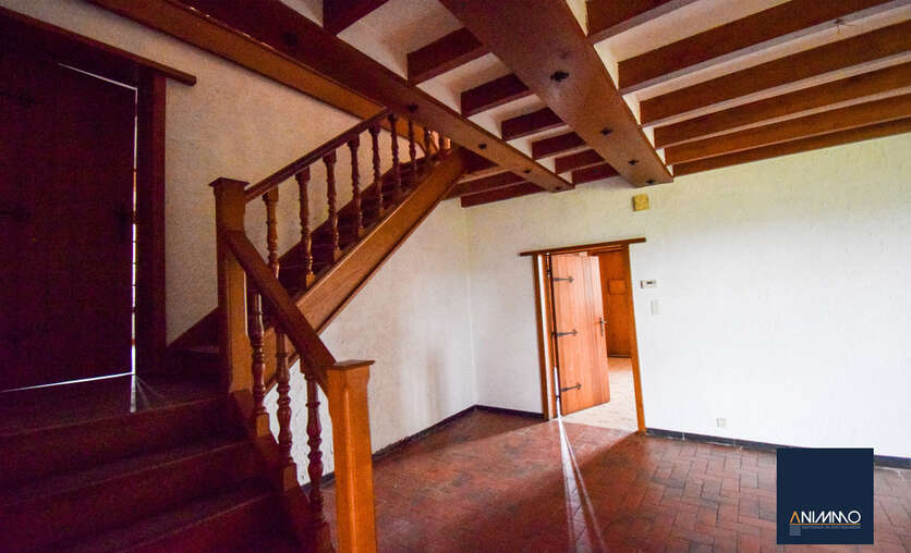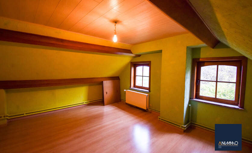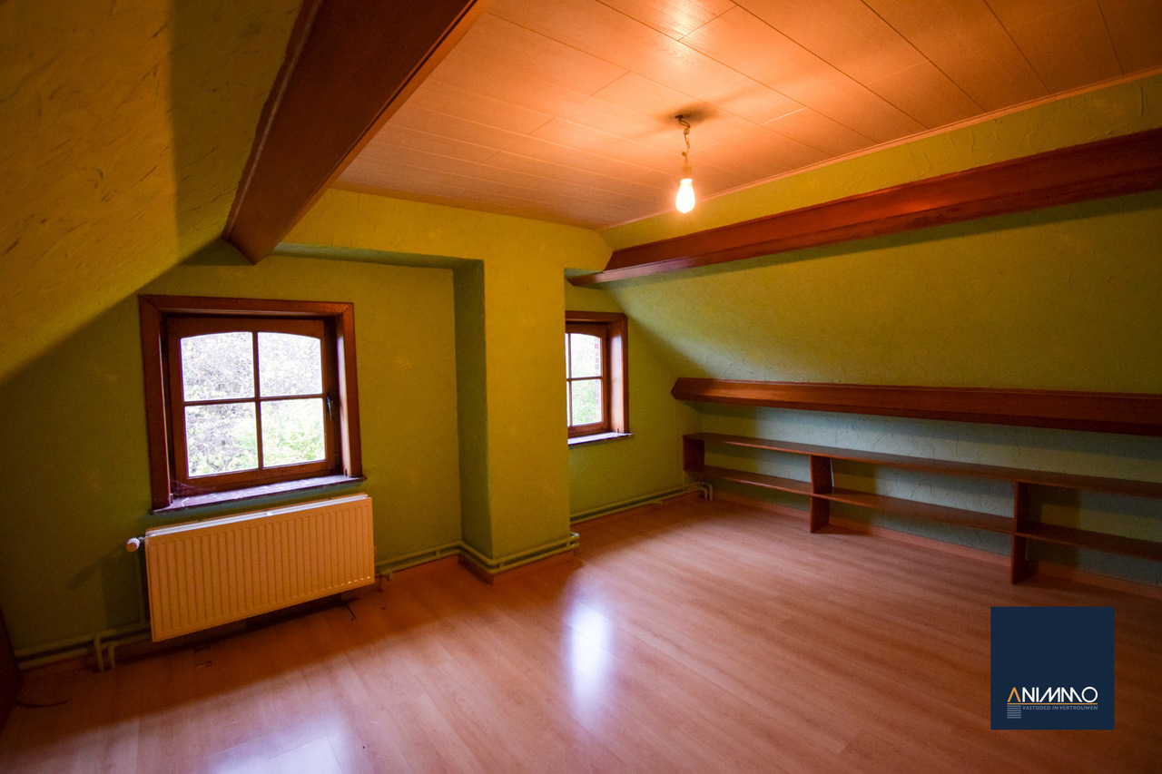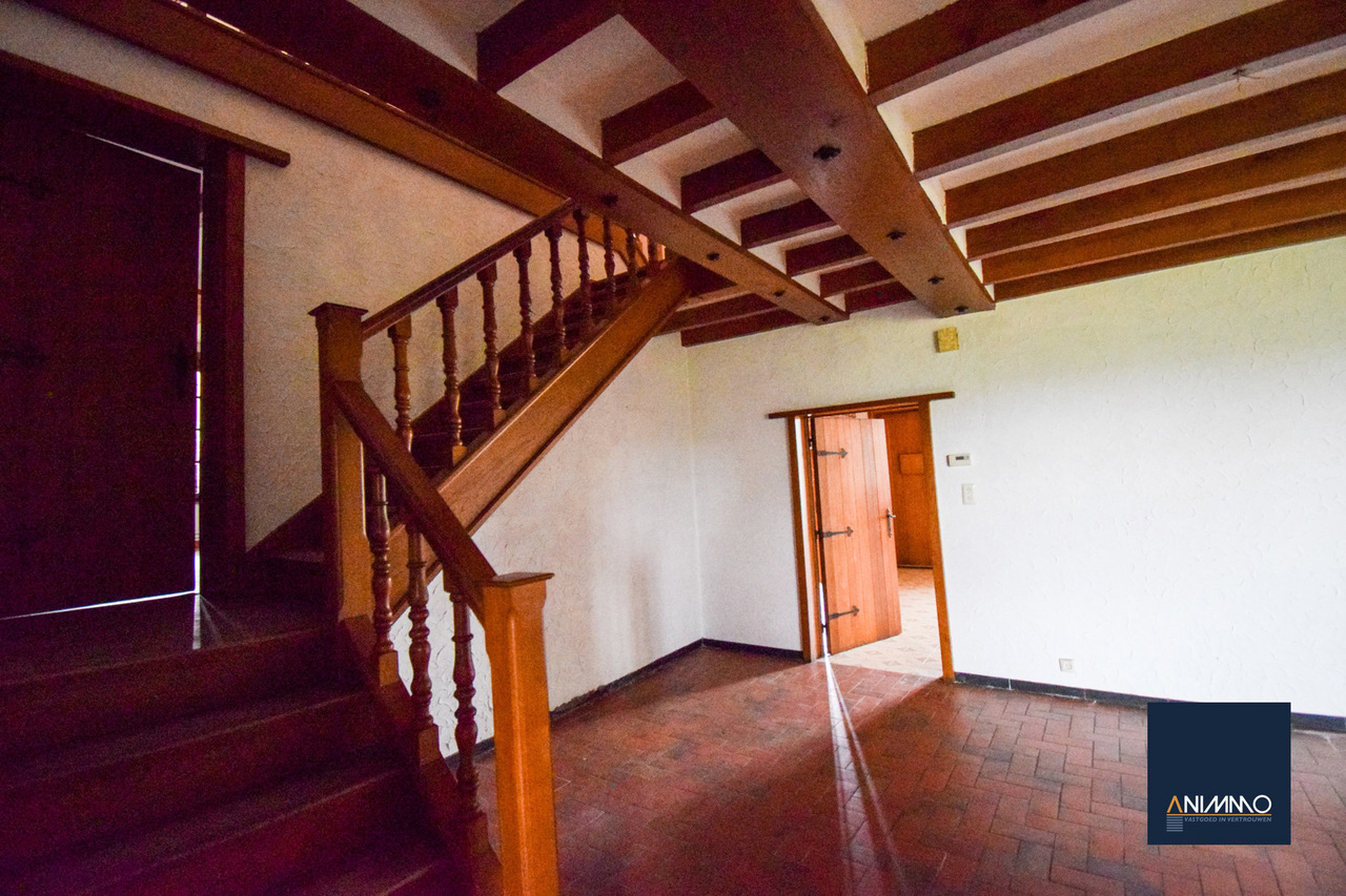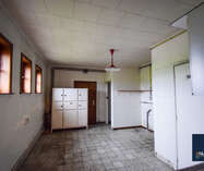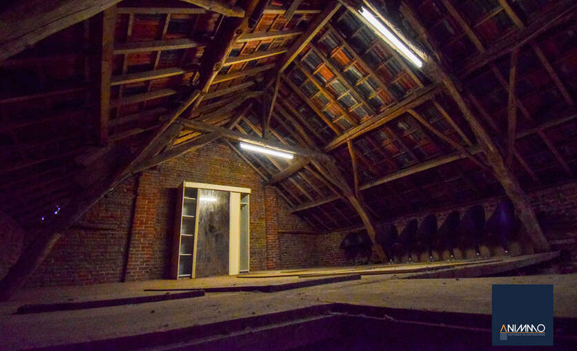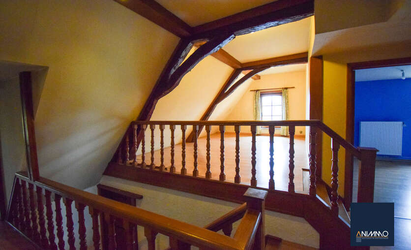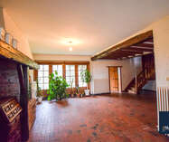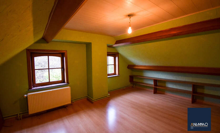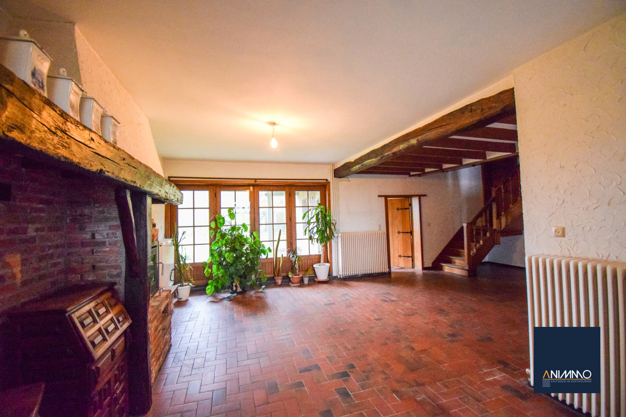 Het overige gedeelte van de hoeve biedt nog veel potentieel voor renovatie en is bijzonder aantrekkelijk dankzij de ruime indeling en de prachtige natuurlijke lichtinval. Op het gelijkvloers bevinden zich een uitnodigende inkomhal, een grote living en salon met uitzicht op de omliggende velden, een keuken met aansluitende kitchenette, een apart toilet, een bureau dat ook als slaapkamer kan dienen, een mansardekamer, een werkplaats en een verwarmingslokaal met toilet. Op de eerste verdieping vind je vier ruime slaapkamers, een badkamer met ligbad, douche en toilet, en een nachthal. Dankzij de grote raampartijen baadt de woning in het licht, wat de authentieke charme nog extra benadrukt. De hoeve beschikt bovendien over een inpandige garage, wat extra praktisch comfort biedt.