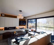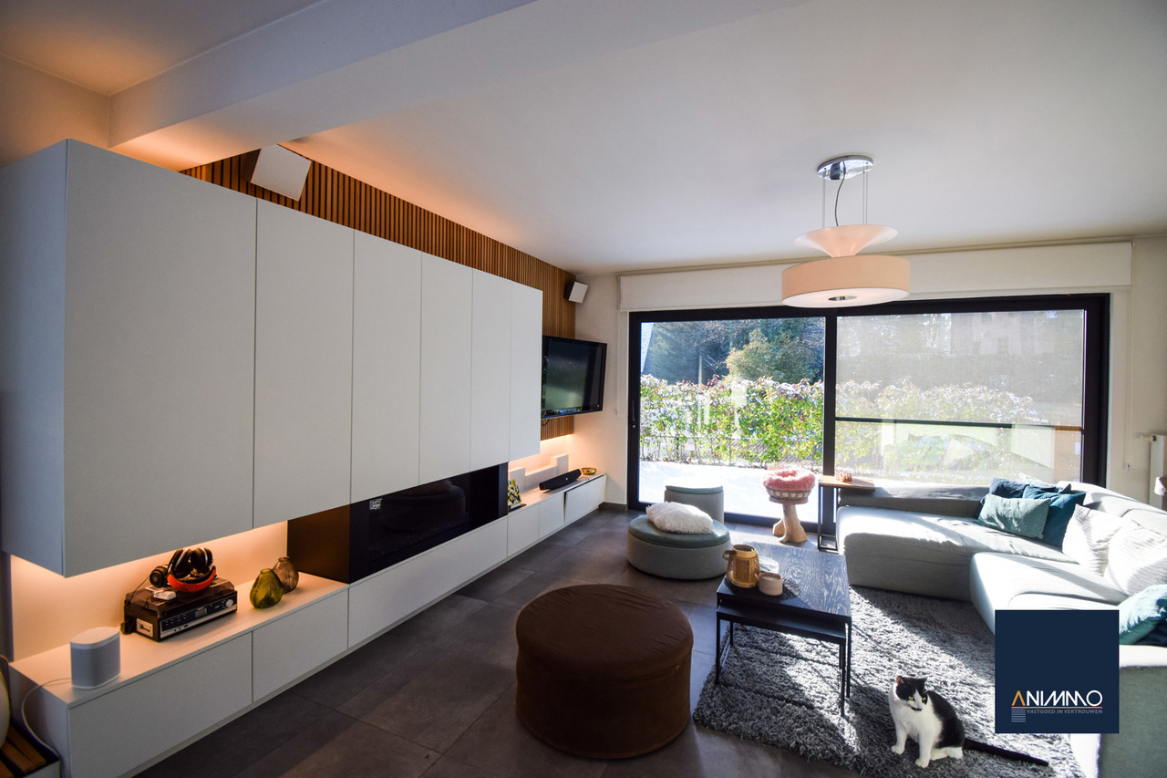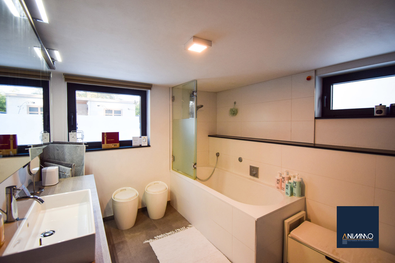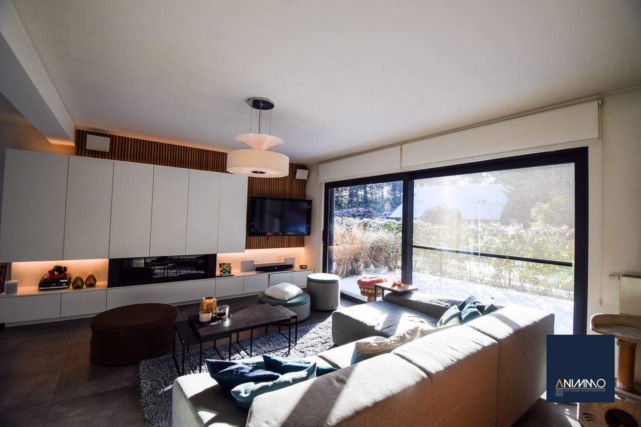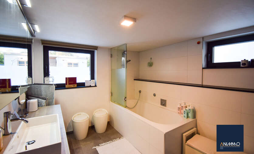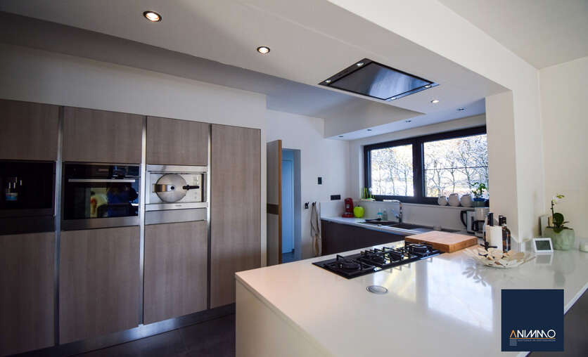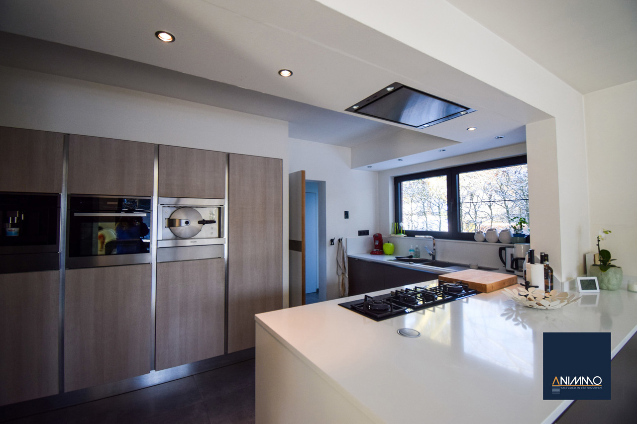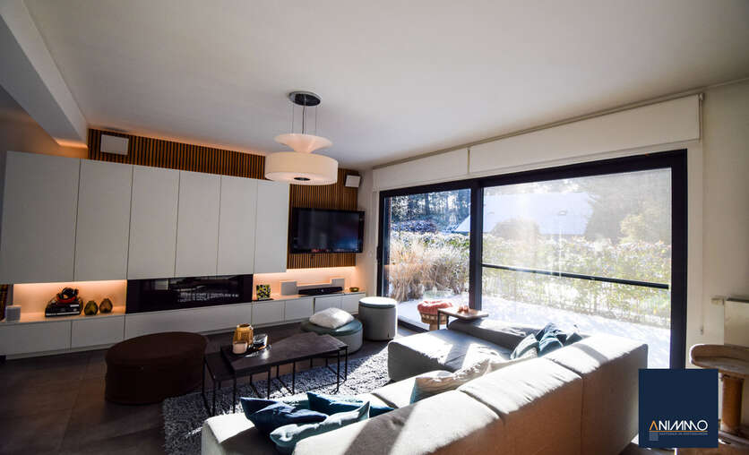 Op het gelijkvloers betreedt u de woning via een inkomhal met traphal en gastentoilet. Verder bevindt zich hier een ruime en lichtrijke leefruimte met een mooi en luxueus ingerichte open keuken, een stijlvolle eethoek en een design living. Deze leefruimte geeft uit op een zuidgericht terras over de volledige breedte van de woning. Daarnaast beschikt dit niveau over een slaapkamer/bureau, een badkamer die nog volledig naar eigen smaak kan worden ingericht en waar aansluitingen voor wasmachine en droogkast zijn voorzien, en twee volwaardige slaapkamers. Op niveau -1 bevinden zich een hobbyruimte, een volledig ingerichte badkamer, een technische ruimte en een aparte berging. Doorheen de woning zorgen ingemaakte kasten voor een strak en harmonieus interieur en extra praktische opbergruimte.