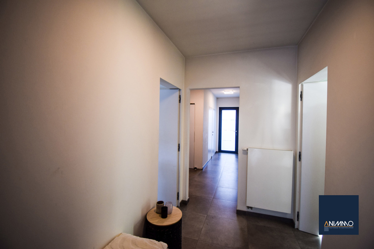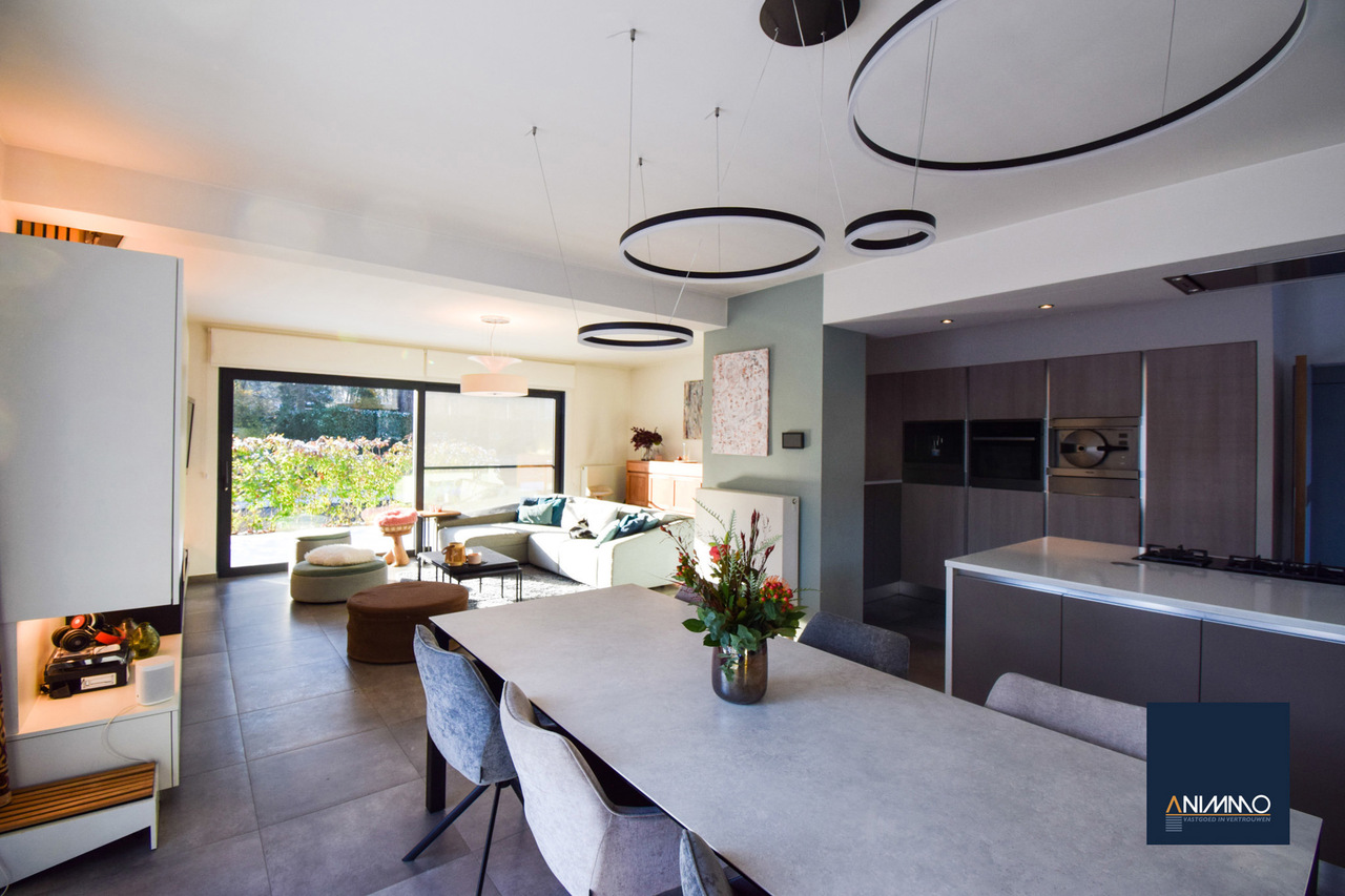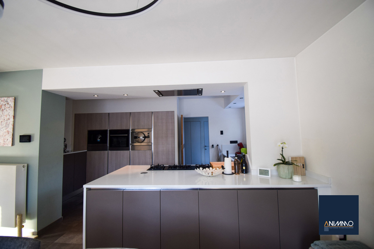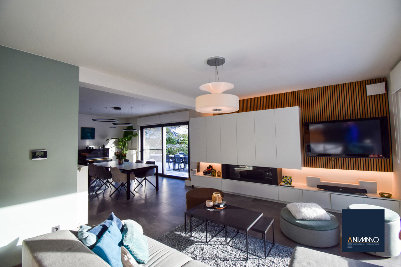 Op het gelijkvloers betreedt u de woning via een inkomhal met traphal en gastentoilet. Verder bevindt zich hier een ruime en lichtrijke leefruimte met een mooi en luxueus ingerichte open keuken, een stijlvolle eethoek en een design living. Deze leefruimte geeft uit op een zuidgericht terras over de volledige breedte van de woning. Daarnaast beschikt dit niveau over een slaapkamer/bureau, een badkamer die nog volledig naar eigen smaak kan worden ingericht en waar aansluitingen voor wasmachine en droogkast zijn voorzien, en twee volwaardige slaapkamers. Op niveau -1 bevinden zich een hobbyruimte, een volledig ingerichte badkamer, een technische ruimte en een aparte berging. Doorheen de woning zorgen ingemaakte kasten voor een strak en harmonieus interieur en extra praktische opbergruimte.