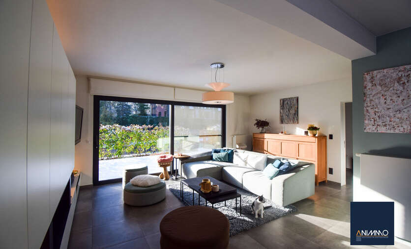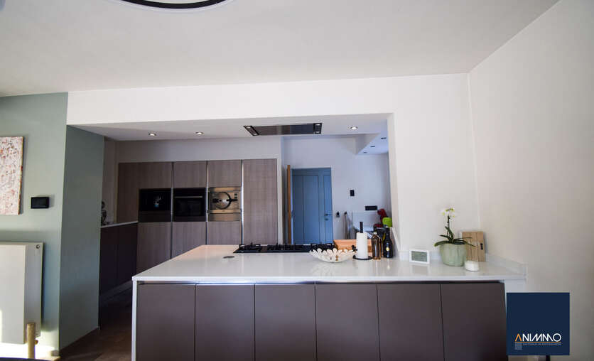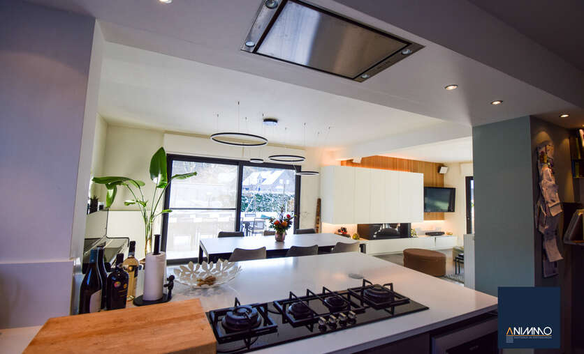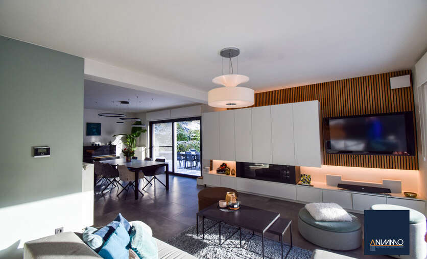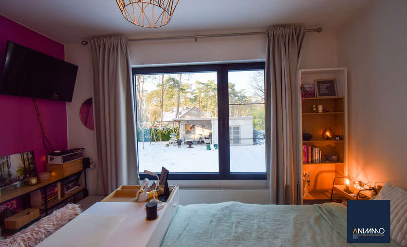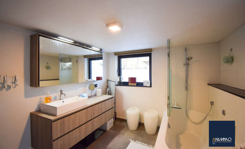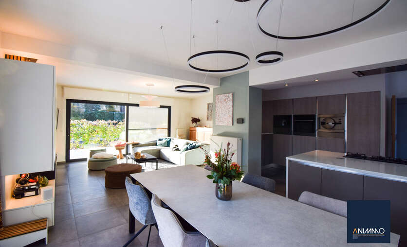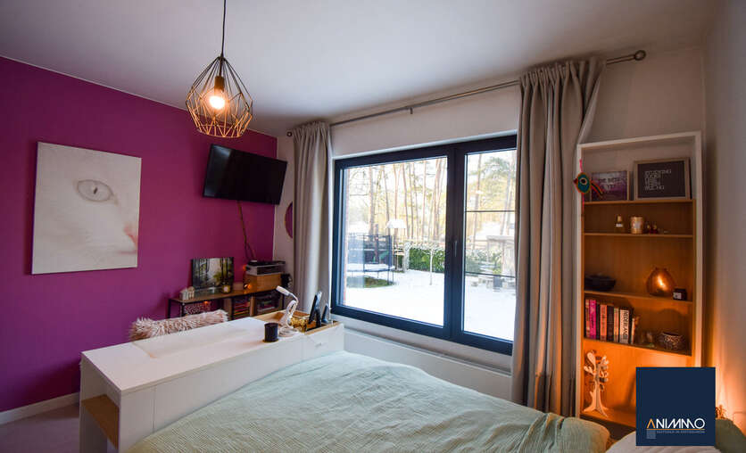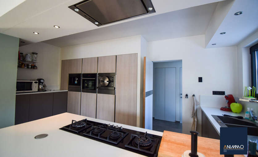 Op het gelijkvloers betreedt u de woning via een inkomhal met traphal en gastentoilet. Verder bevindt zich hier een ruime en lichtrijke leefruimte met een mooi en luxueus ingerichte open keuken, een stijlvolle eethoek en een design living. Deze leefruimte geeft uit op een zuidgericht terras over de volledige breedte van de woning. Daarnaast beschikt dit niveau over een slaapkamer/bureau, een badkamer die nog volledig naar eigen smaak kan worden ingericht en waar aansluitingen voor wasmachine en droogkast zijn voorzien, en twee volwaardige slaapkamers. Op niveau -1 bevinden zich een hobbyruimte, een volledig ingerichte badkamer, een technische ruimte en een aparte berging. Doorheen de woning zorgen ingemaakte kasten voor een strak en harmonieus interieur en extra praktische opbergruimte.